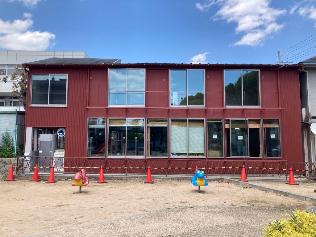 青空と赤い壁の対比が映えるユキヒラやねやねは、建築家・橋本健史氏の設計、施工は津島建設株式会社です。